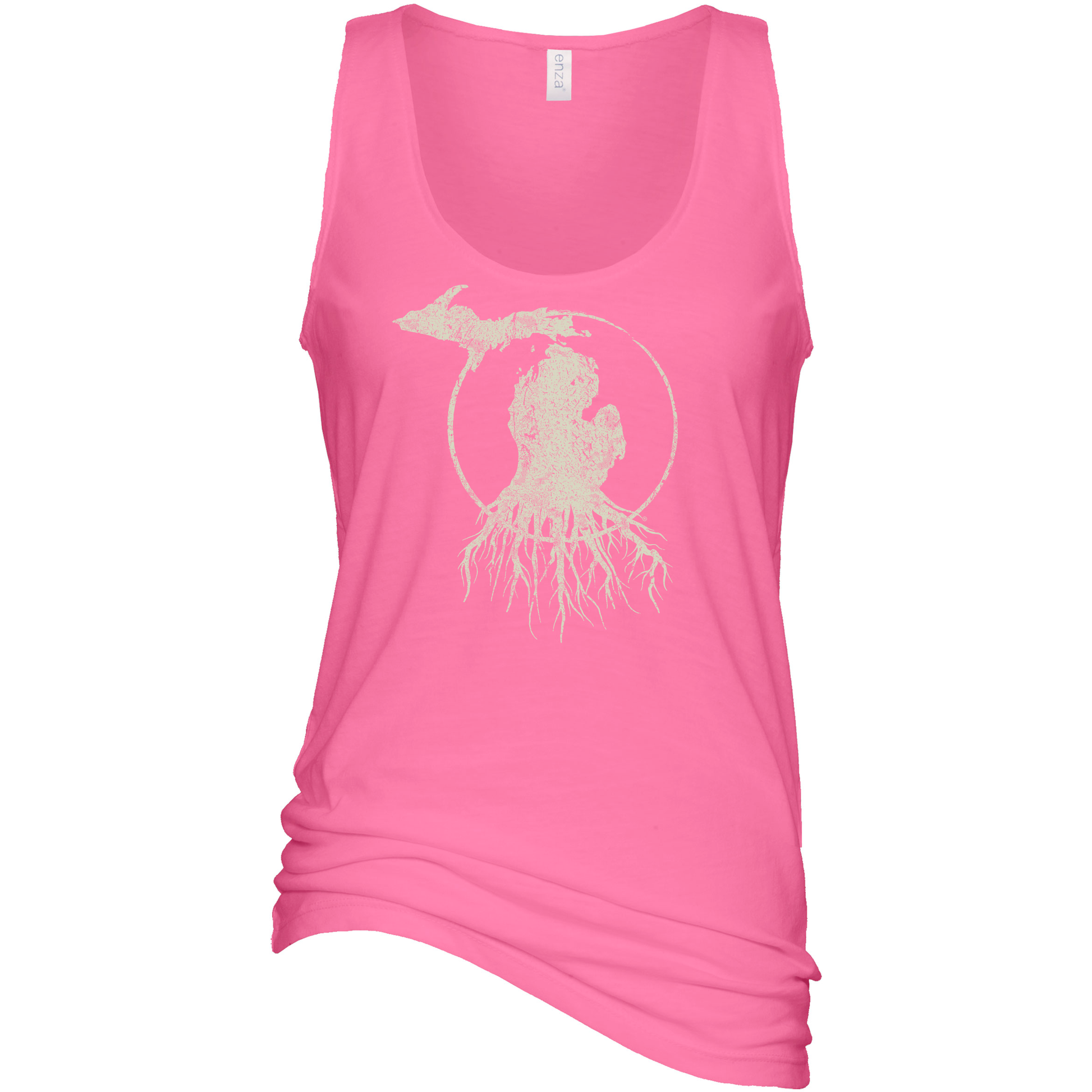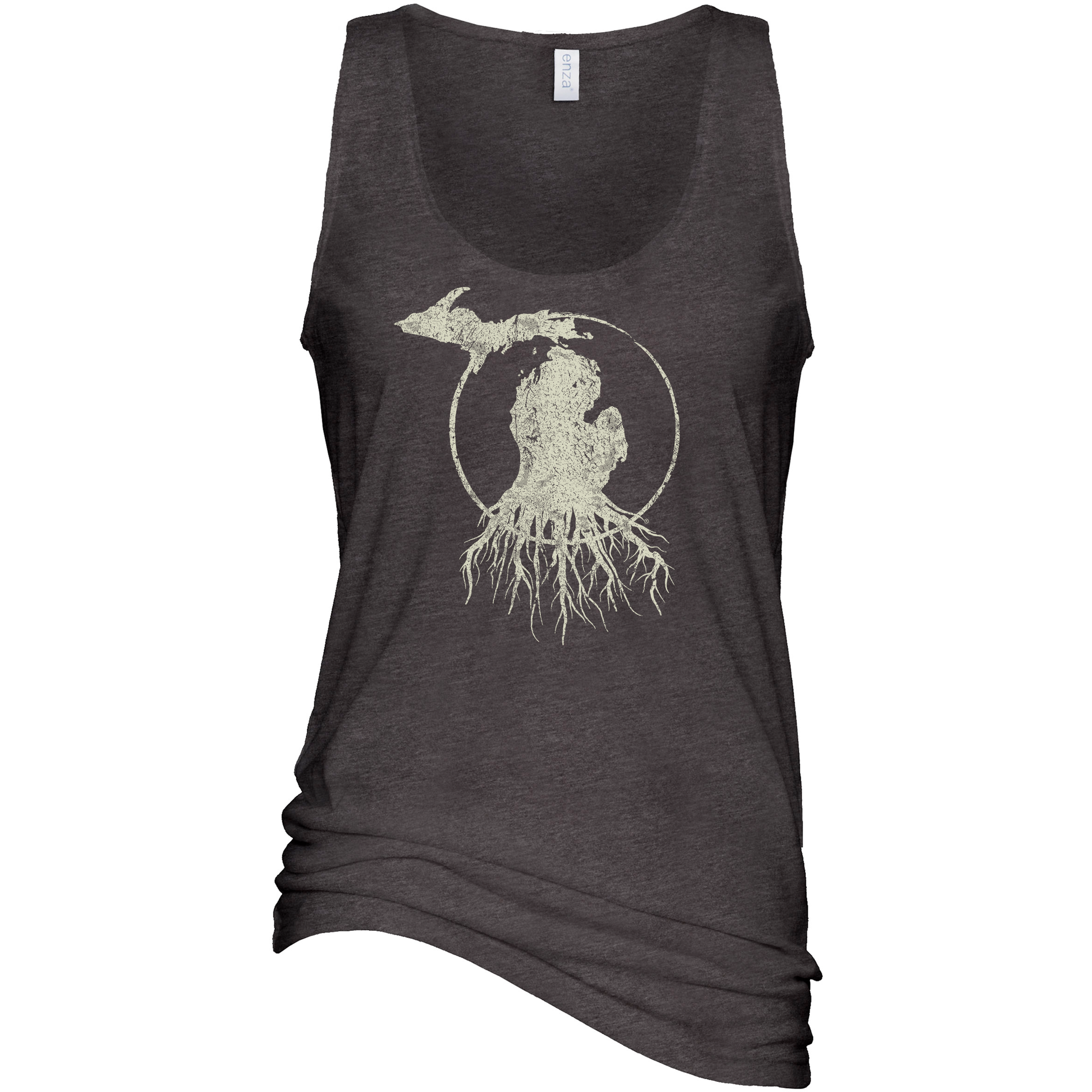 Featuring the original MI Roots logo, in an off-white screen print. The back features a small "Rooted in Michigan" stamp between the shoulders.